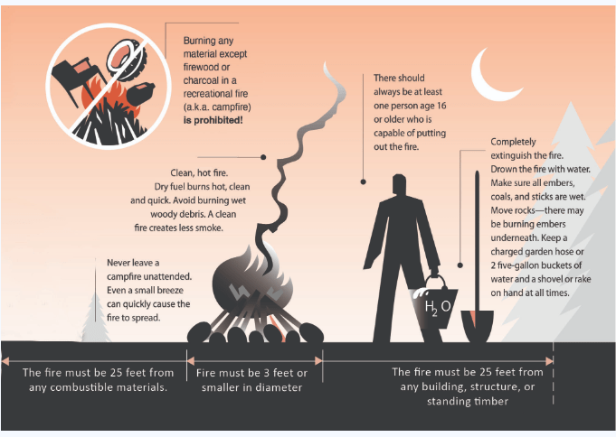 - Campfires. Fire must not be bigger than 3 feet x 3 feet x 2 feet. Burn only dry, seasoned firewood. Your smoke cannot affect your neighbors.