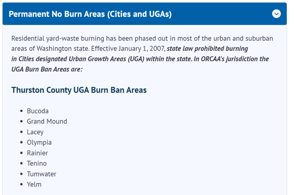The Wilderness neighborhood is in the Thurston County Urban Growth Area (UGA). By state law RCW: 70A.15.5020, non-recreational burning is banned in UGAs therefore, burning of garbage or yard waste is prohibited. See below for definition of what “recreational burning” includes.