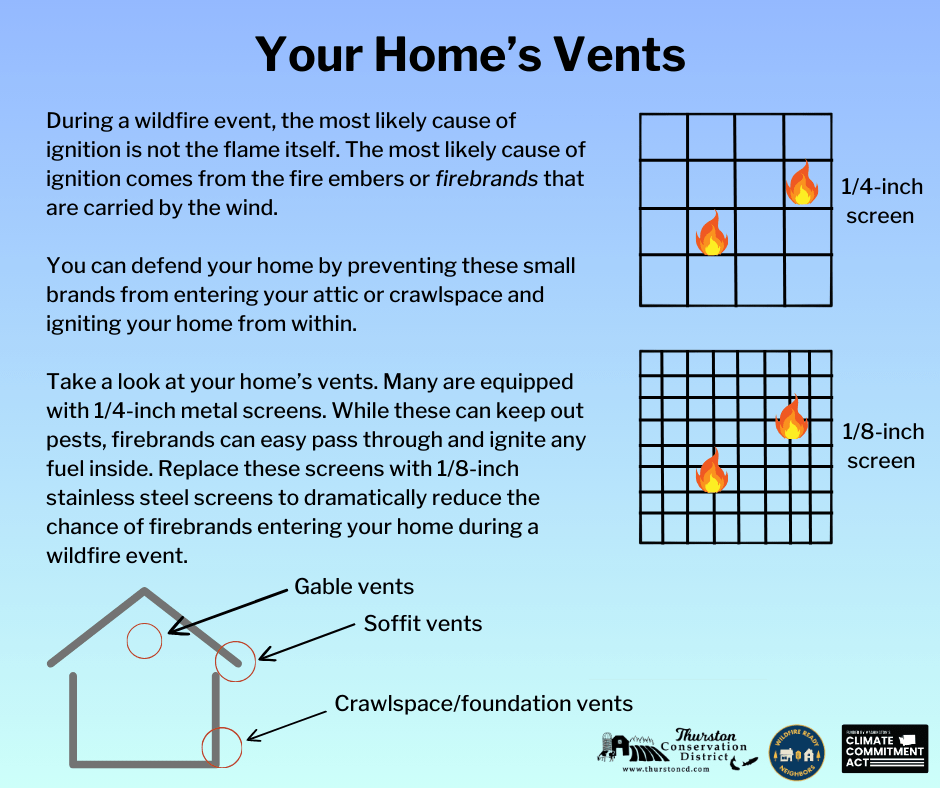 Each of us can do something, however small, to give our homes and properties a fighting chance if, in the unhappy event, a fire comes through our neighborhood. From clearing bushes and storing firewood away from your house, to replacing your vents with 1/8″ mesh screening to make it difficult for embers to get inside and catch fire.